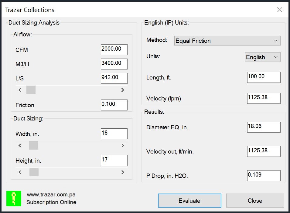 Esta función se basa en métodos: igual fricción, velocidad constante y recuperación estática. Es fácil de usar y muy conveniente para dimensionar ductos y verificar los sistemas de conductos existentes.